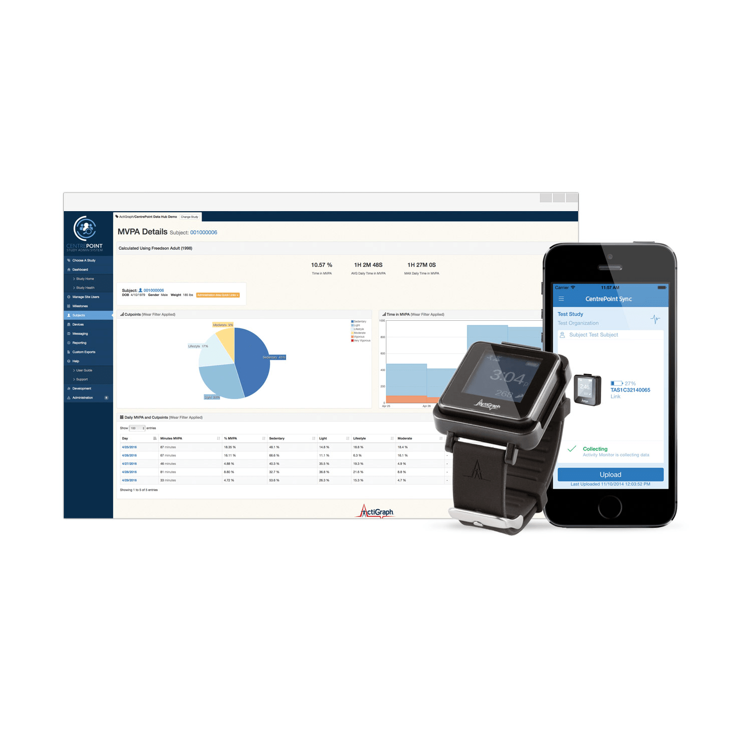 The compact and stylish CentrePoint Insight Watch captures and records continuous high-resolution raw acceleration data, sampled up to 256 Hz, to support the development of novel endpoints related to real-world activity, mobility, and sleep behaviors to provide objective, real-world physical activity, mobility, and sleep measures, in near real time.