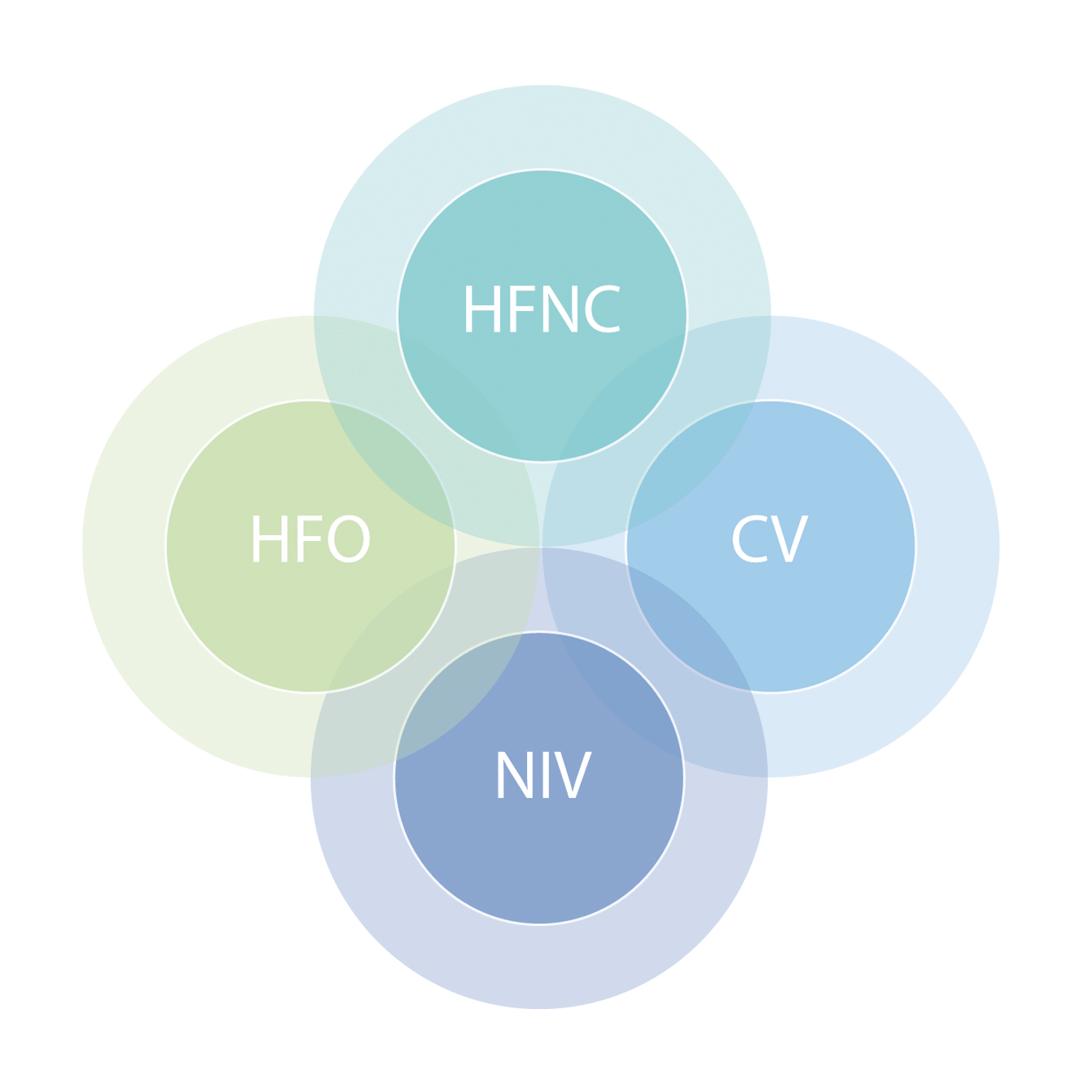 All neonatal and pediatric conventional ventilation modes (Volume Guarantee included), Non-Invasive Ventilation modes (NIV), O2 therapy with High Flow Nasal Cannula (HFNC) and unique High Frequency Oscillation (HFO) with Lung Recruitment Maneuver and Volume Guarantee.