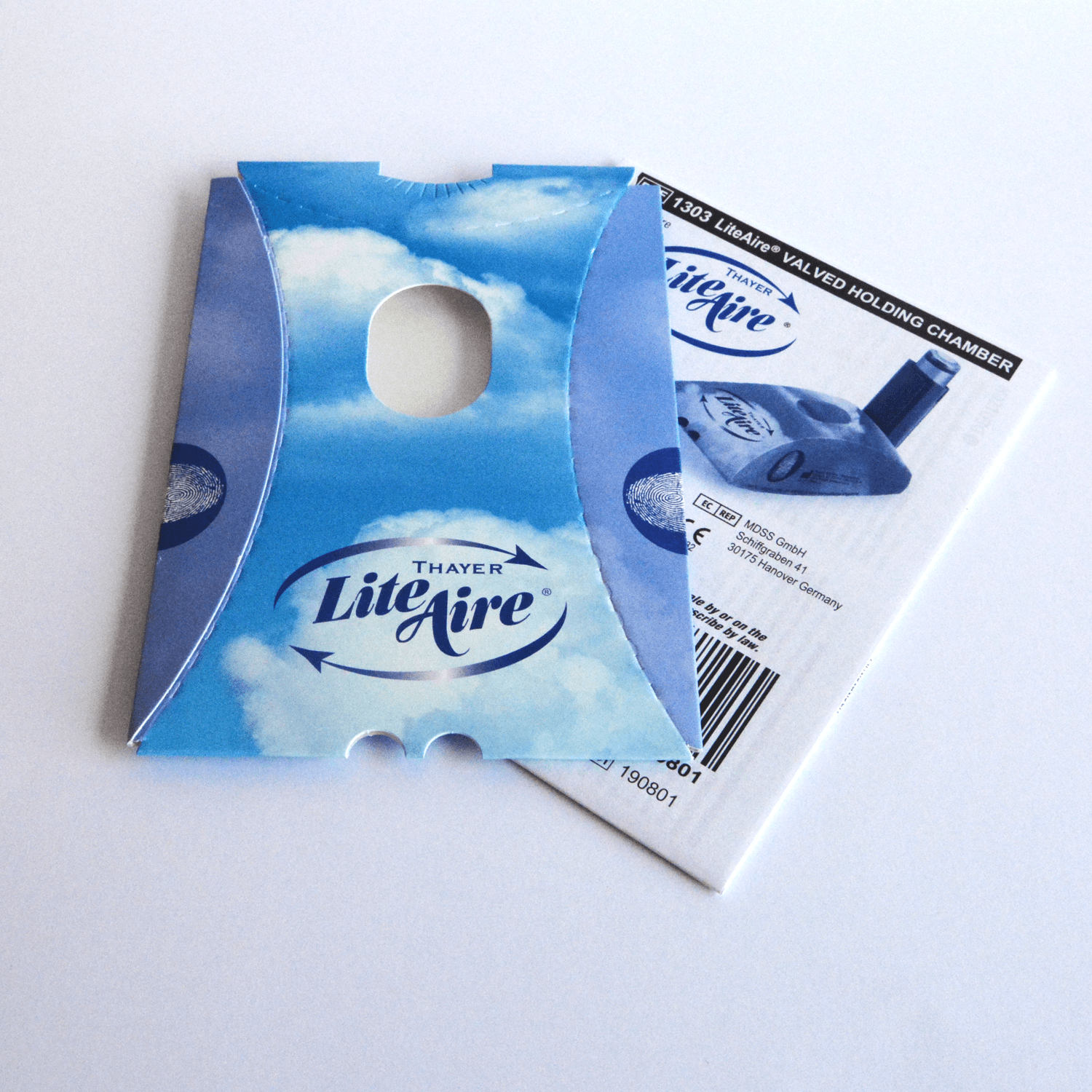 The LiteAire® collapsible MDI holding chamber is a unique MDI holding chamber and an innovative alternative. LiteAire’s unique dual-valved MDI holding chamber design delivers pop-up convenience and effective drug output at a fraction of the cost of most plastic holding chambers. In many clinical settings, the LiteAire can reduce costs by replacing existing rigid plastic holding chambers or inefficient spacers with a paperboard alternative. The unique design allows the LiteAire to be reused by a patient over multiple doses and meets and often exceeds the performance of plastic holding chambers.